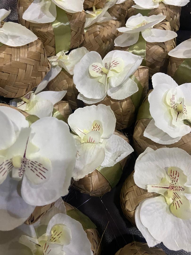 Fully decorated with delicate white or green orchids and a satin ribbon accent, these boxes bring a touch of natural elegance and tradition to your wedding door gifts, festive hampers, or event favors.